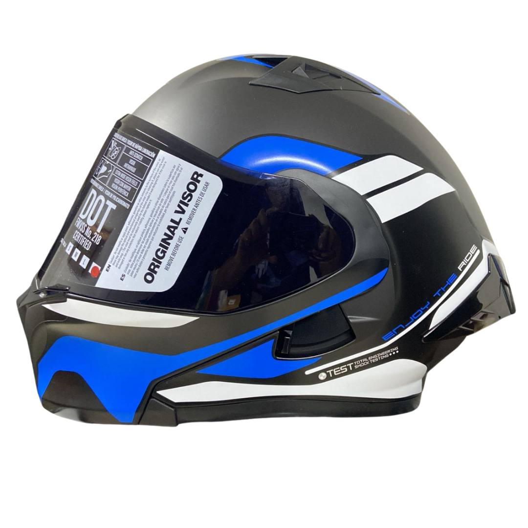 Visor azul con tratamiento anti-rayas, que proporciona buena visibilidad y un estilo llamativo.