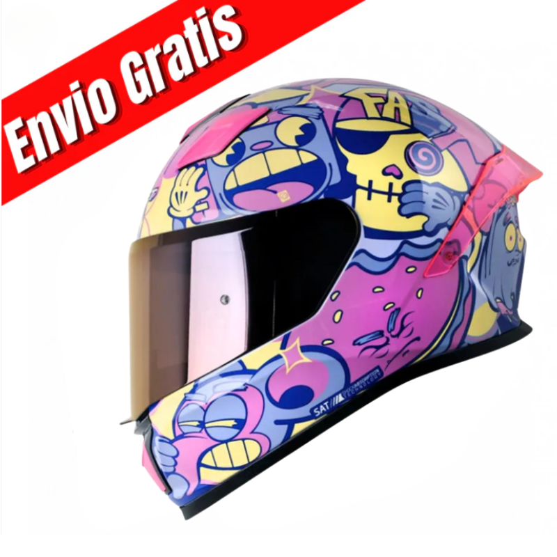 Este casco integral SHAFT 559 DIMON combina un diseño moderno en tonos morado y rosado con materiales de alta calidad que ofrecen máxima seguridad. Cuenta con un visor intercambiable en color, ideal para mayor comodidad visual en diferentes condiciones de luz. Su estructura es aerodinámica, con sistema de ventilación y acolchado interno desmontable y lavable. Perfecto para moter@s que buscan destacar con un toque único sin comprometer su protección.