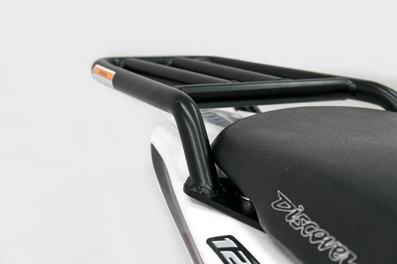 - Parrilla especialmente diseñada para la Discover 125 St. Soporta cualquier baul o maletero del mercado permitiendo montarlo en segundos. Puede montar una maleta o también amarrar cosas a ella. Su superficie plana en la parte superior permite instalar un maletin impermeable sin romperlo y es reforzada en su estructura para evitar fallos comunes en este tipo de herrajes de moto.